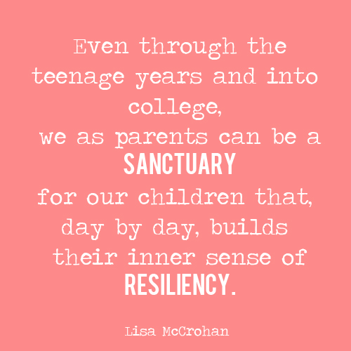 I have all sorts of theories on why our children may not be as resilient and ideas about how to deepen their resiliency. But this I know for certain: even through the teenage years and into college, we as parents can be a sanctuary for our children that, day by day, builds their inner sense of resiliency.