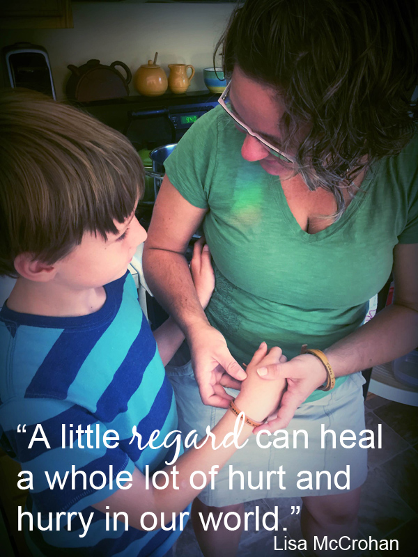 What would our world be like if we just regarded OURSELVES and each other? The cashier at the supermarket, the person in front of you who walks slower than you, the parents of the other soccer team, your own partner, your own children, your own mom and dad, and the aging reflection you see in the mirror? A little regard can heal a whole lot of hurt and hurry in our world.