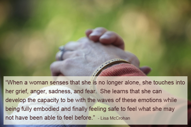 I’ve journeyed alongside clients and held space for and witnessed what happens when a woman begins to sense she is not along.  She begins to “touch into” her grief, anger, rage, sadness, and fear.  She learns that she can develop the capacity to be with the waves of these emotions while being fully embodied and finally feeling safe to feel what she may not have been able to feel before.