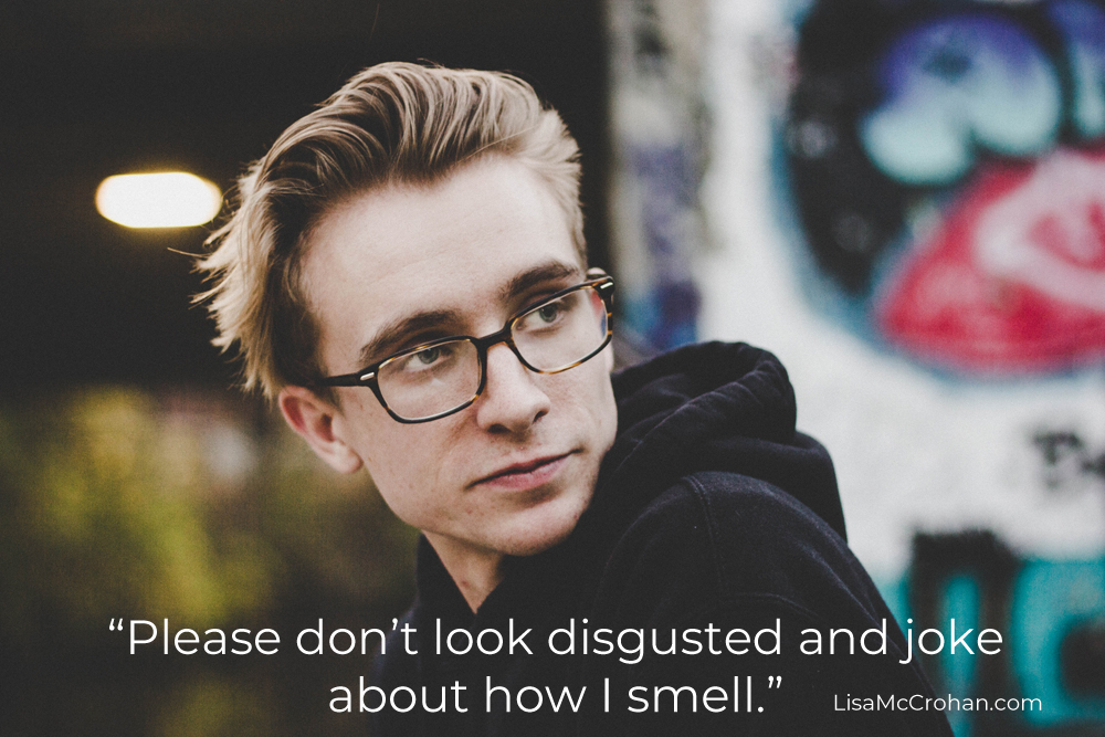 Awhile back I was talking to a client who has a tween son. She said to me, “Sports have started up and OHHHHH my god, the smell!” She told the story of how he came home from practice and she was like, “Ewww! You smell!” Later on, she and her husband had a talk about their growing son. He said to her, “Don’t walk by him and say things like ‘Ewwww!’ He’s going to have enough people making fun of him. Let’s not add to it.”
