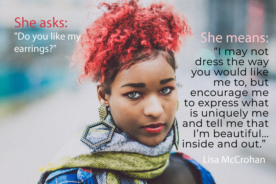 When she asks, “Do you like my earrings?” Know that she is trying to express herself AND fit in. Know that she wants your opinion AND also she doesn’t. Know that she is looking for reassurance.