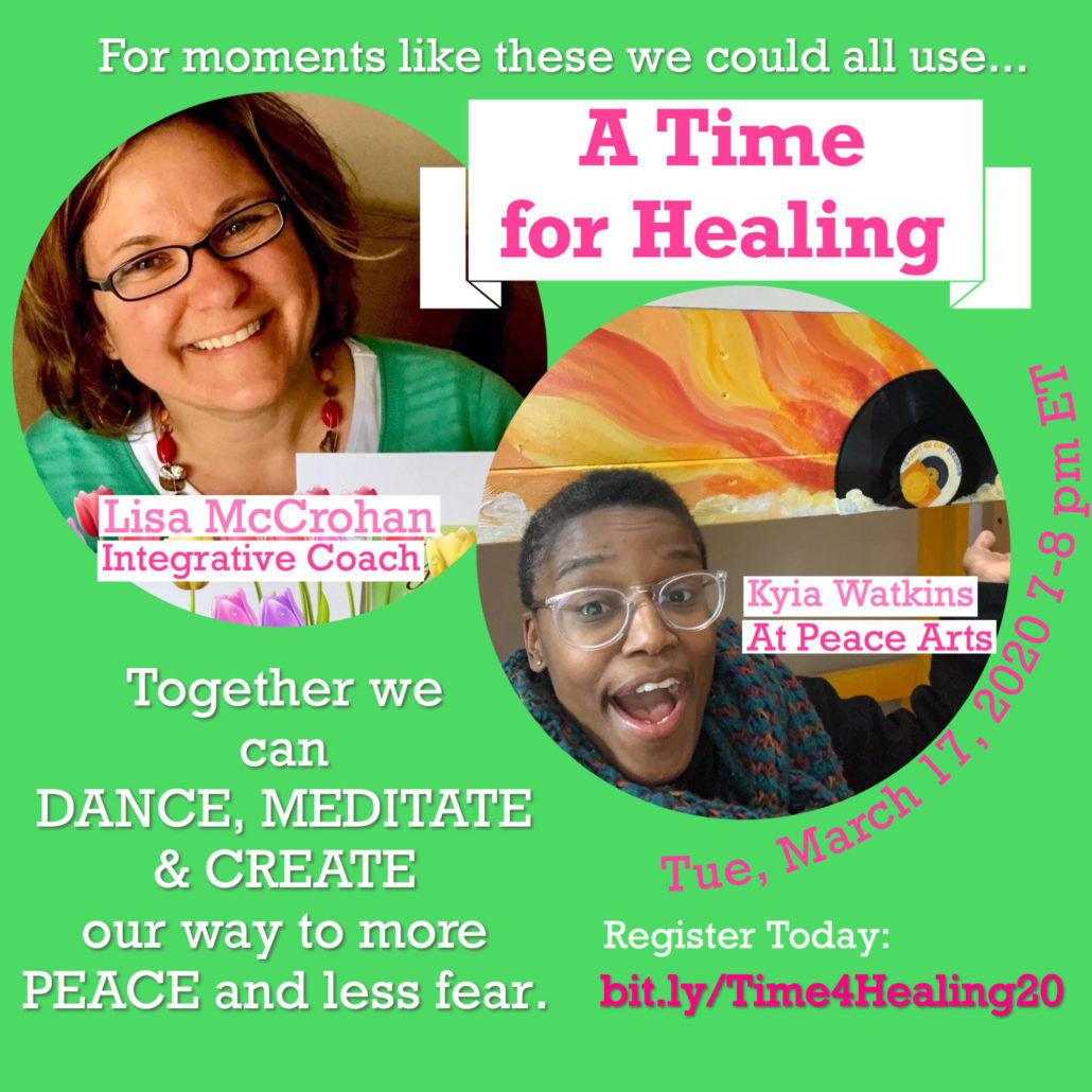 Dance, Meditate, and Paint Party, A TIME FOR HEALING, March 17, 7 pm EST. It’s free and online, but you have to register. We’ll be using Zoom – download the app and join us!